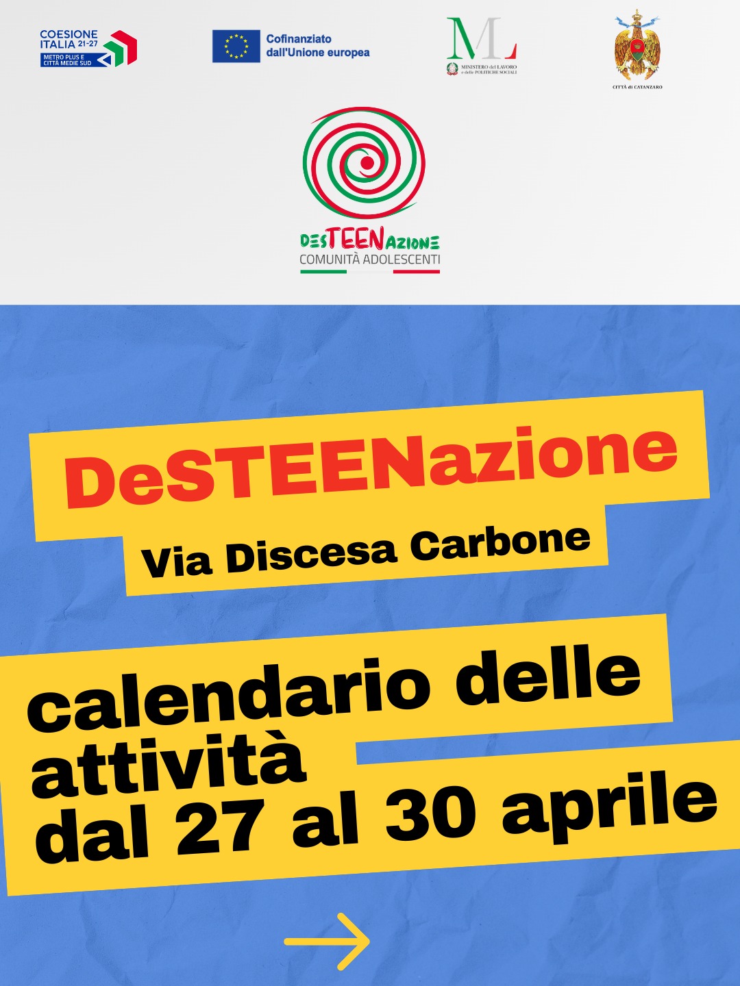 DeSTEENazione – Comunità Adolescenti è un'iniziativa promossa dalla Città di Catanzaro nell'ambito del programma Coesione Italia 21–27 / Metro Plus e Città Medie Sud, cofinanziata dall'Unione Europea e sostenuta dal Ministero del Lavoro e delle Politiche Sociali.